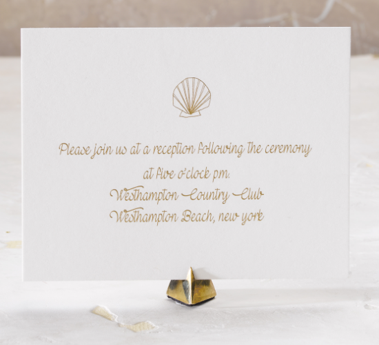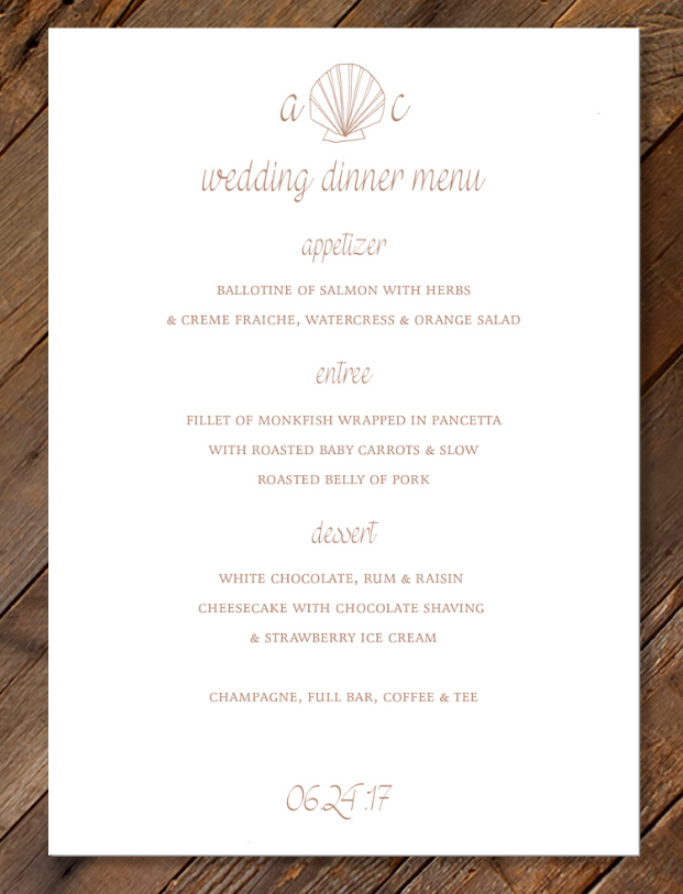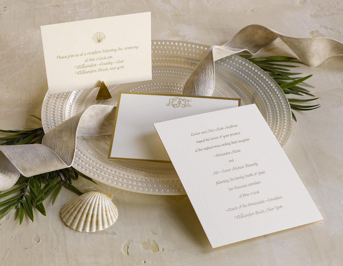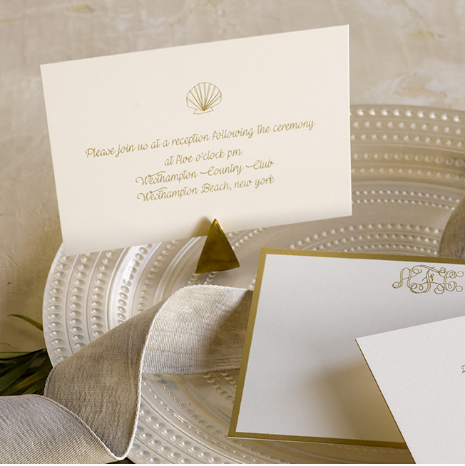 - Motif: Scallop Shell, Vine monogram, hand bordering in gold ink