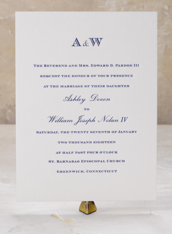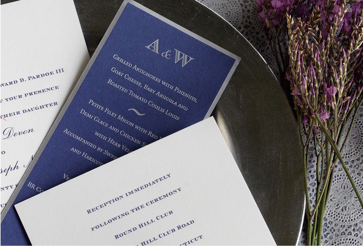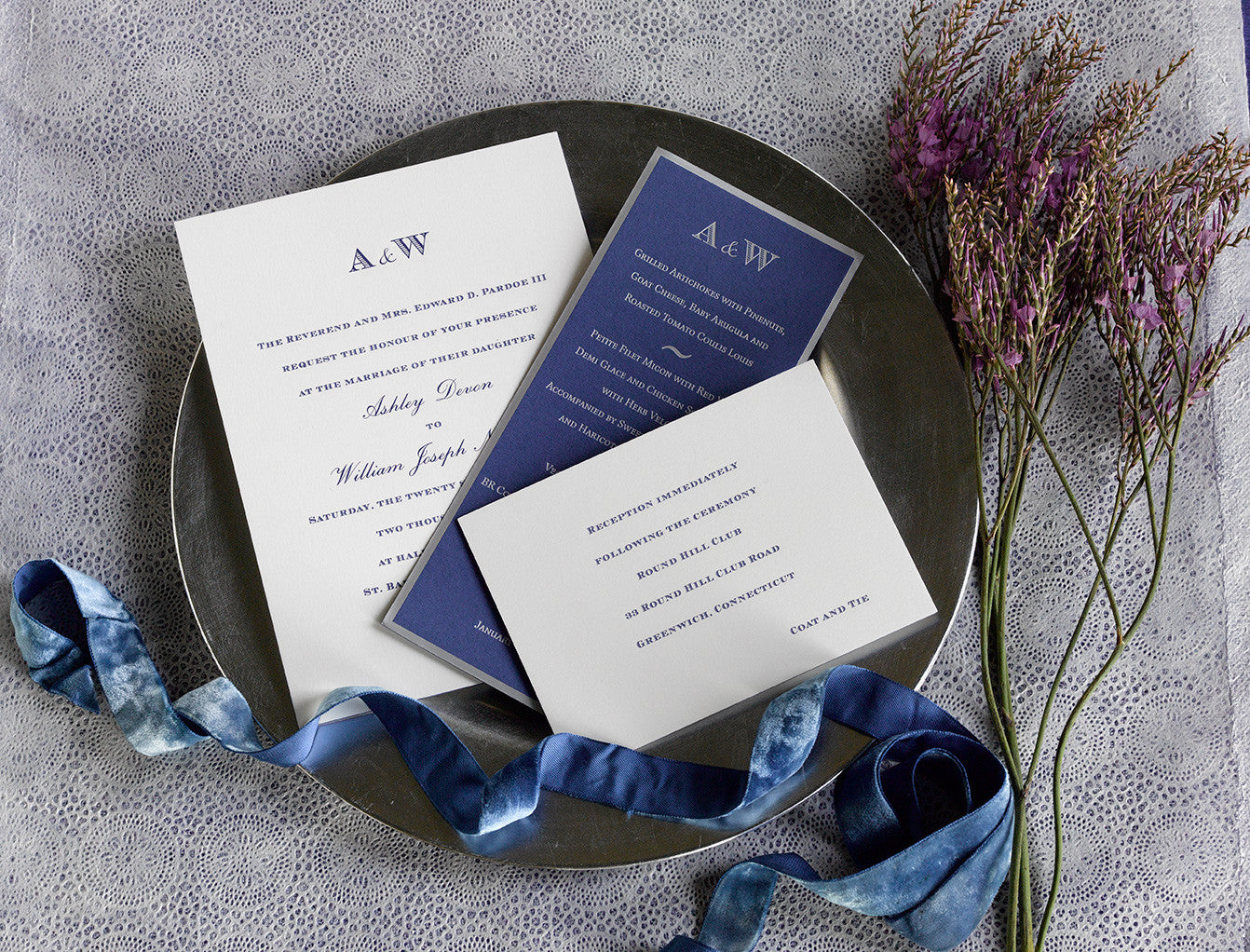 Ashley + Liam is a engraved wedding suite by Pickett's Press. Also available with letterpress, thermography, foil or digital print methods.