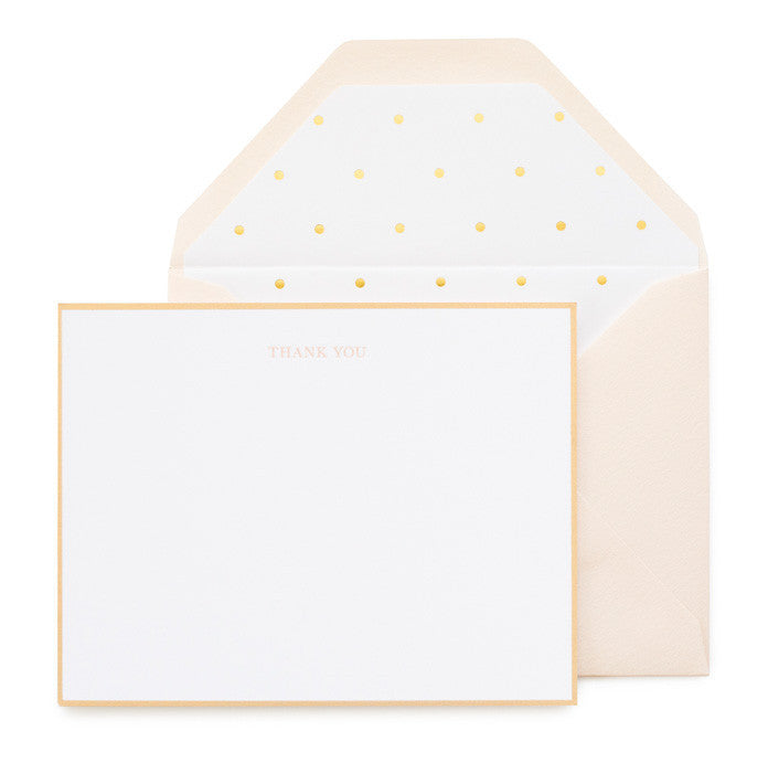 The Bordered Pink Thank You note cards are letterpress printed by hand on antique machinery. A beautiful pale pink ink on white paper is accented with a gold border and complemented with a pale pink envelopeand a gold foil polka dot liner.