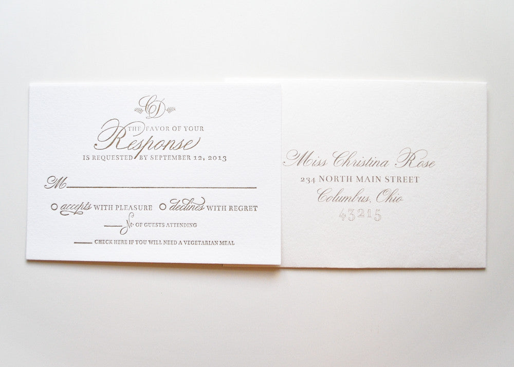 Invite purchase includes envelope with return address printing. Reply purchase includes return address printing.