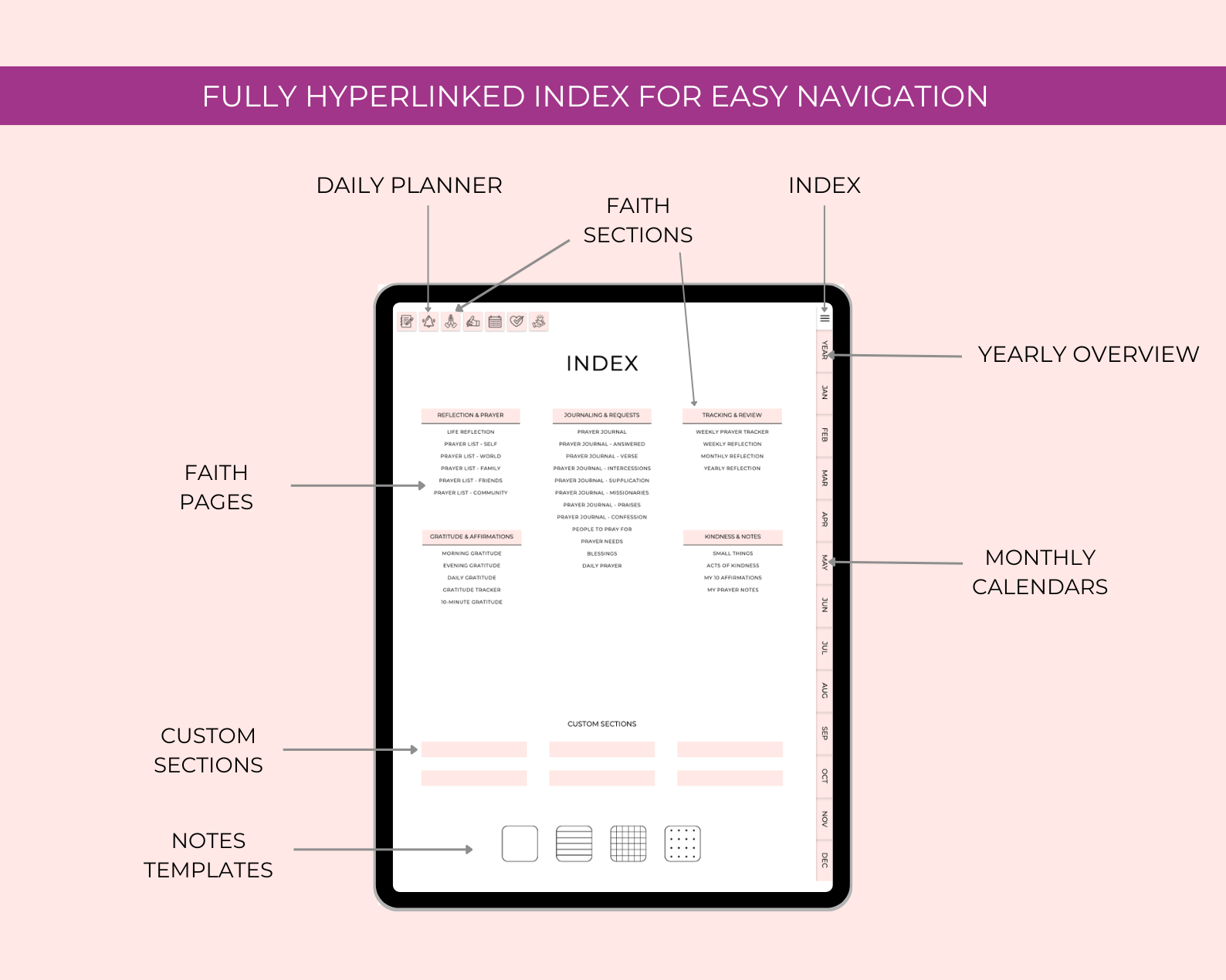 This beautifully designed journal includes hyperlinked navigation to easily guide you through prayer prompts, scripture journaling, gratitude practices, and more. Organize your thoughts, track answered prayers, and cultivate a more intentional prayer life—all from your tablet or device.