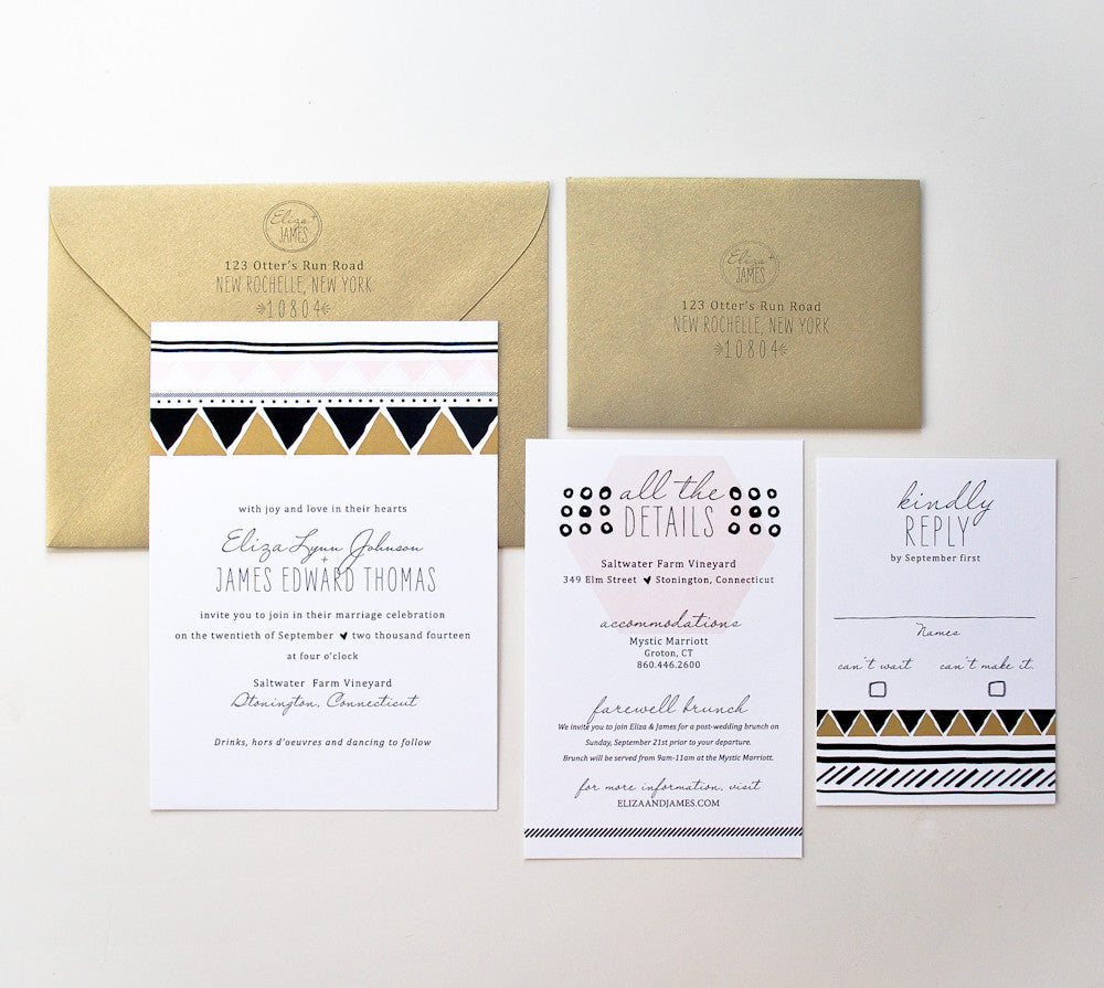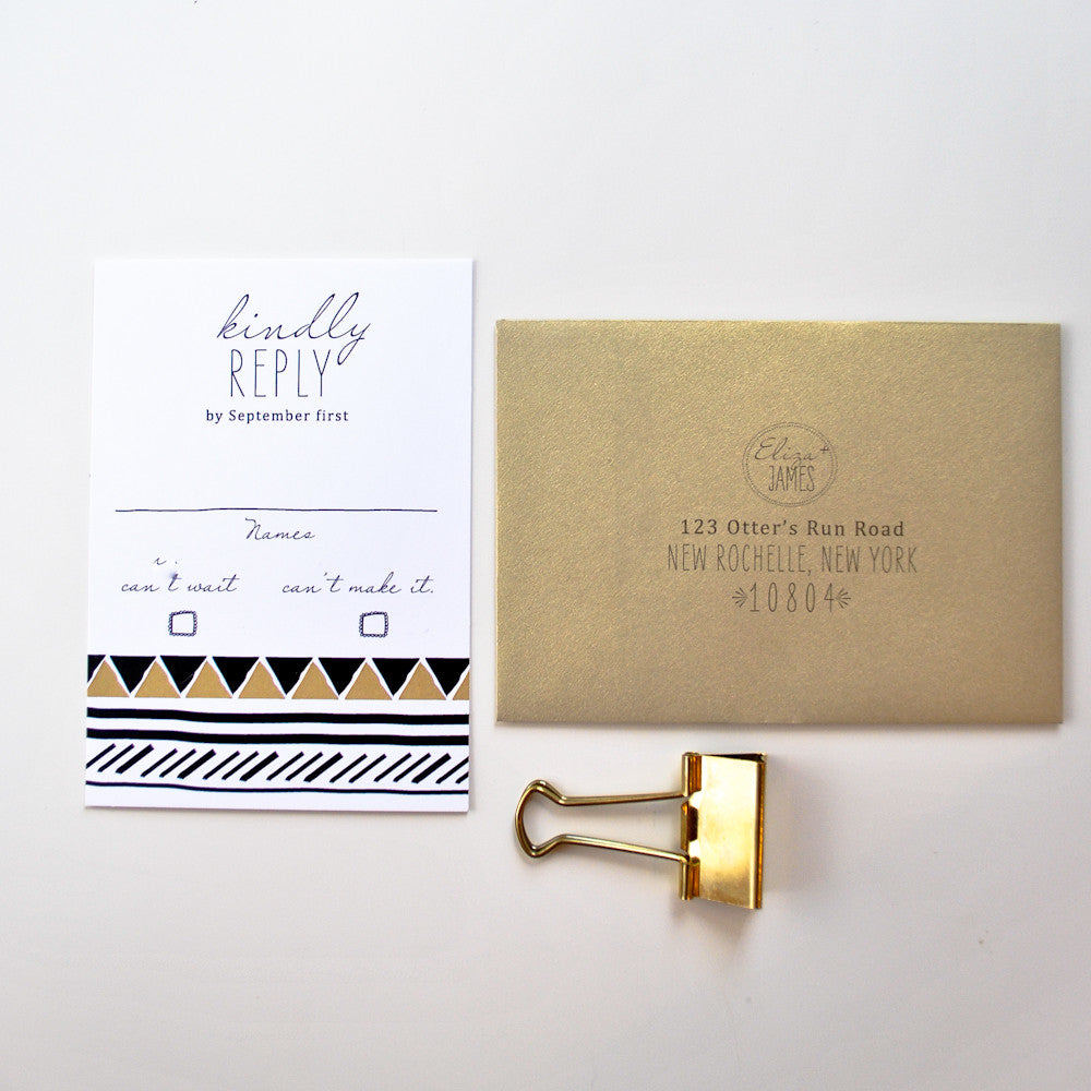 Invite purchase includes envelope with return address printing. Reply purchase includes return address printing.