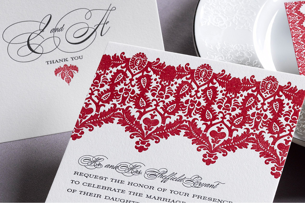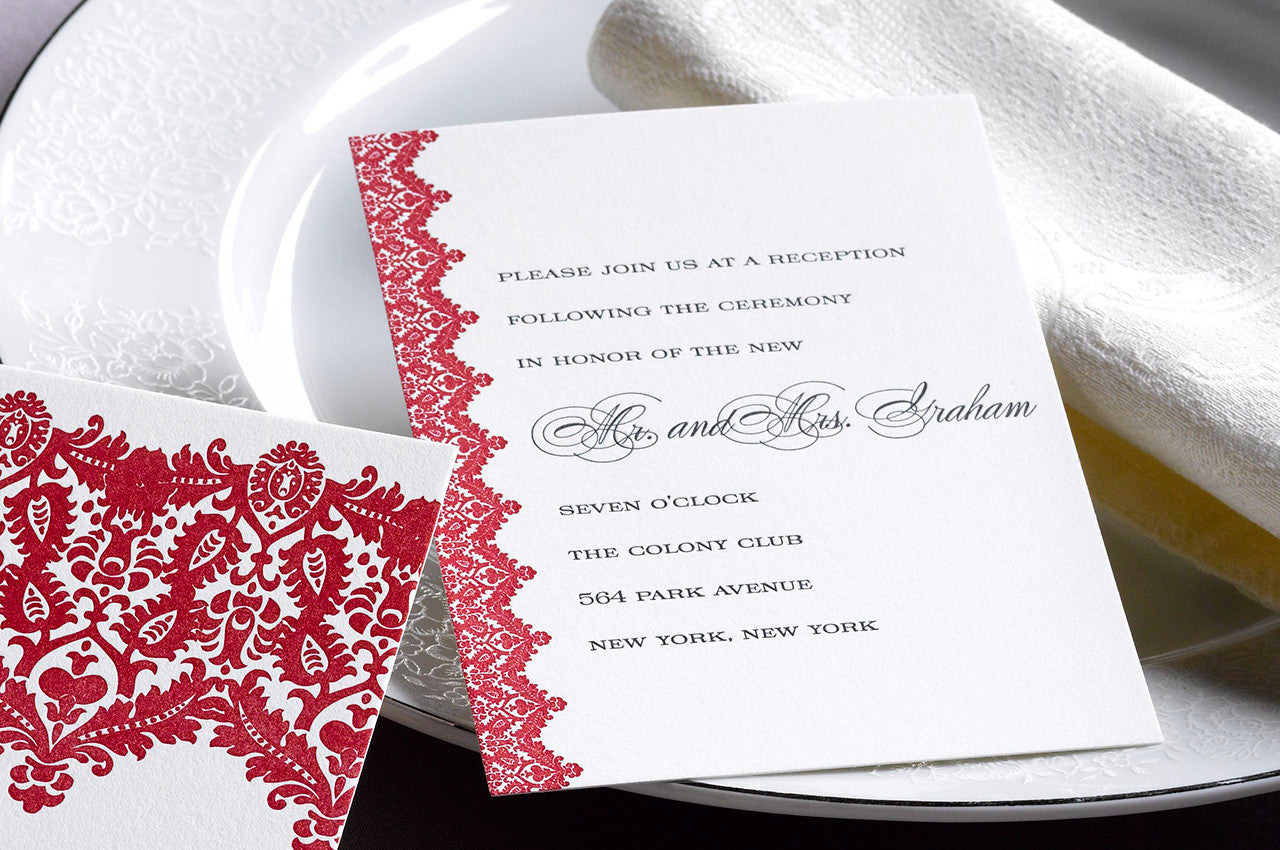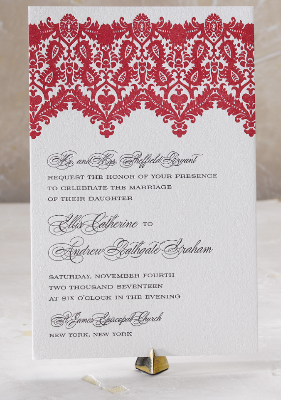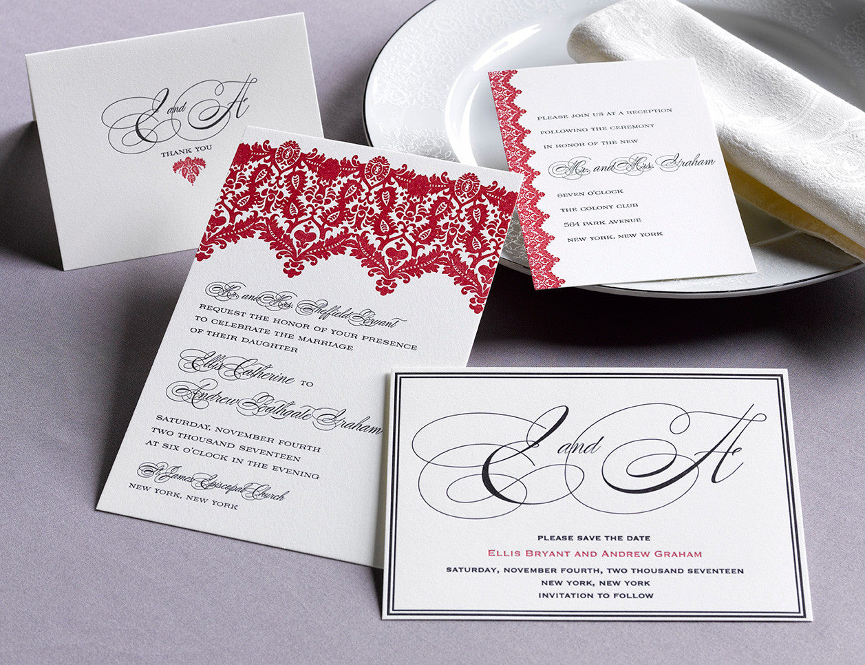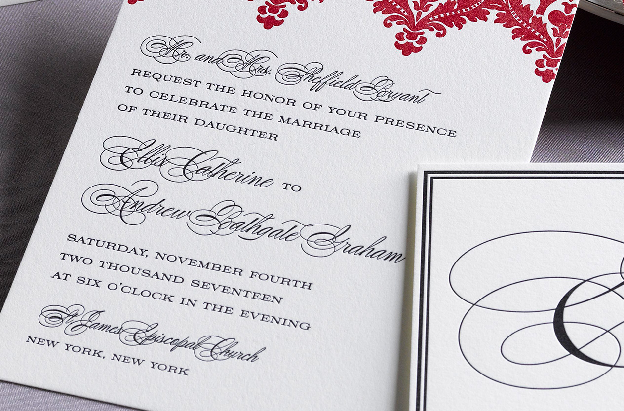 Ellis + Andrew is shown as a letterpress wedding suite by Pickett's Press. Also available with engraving, thermography, foil or digital print methods.