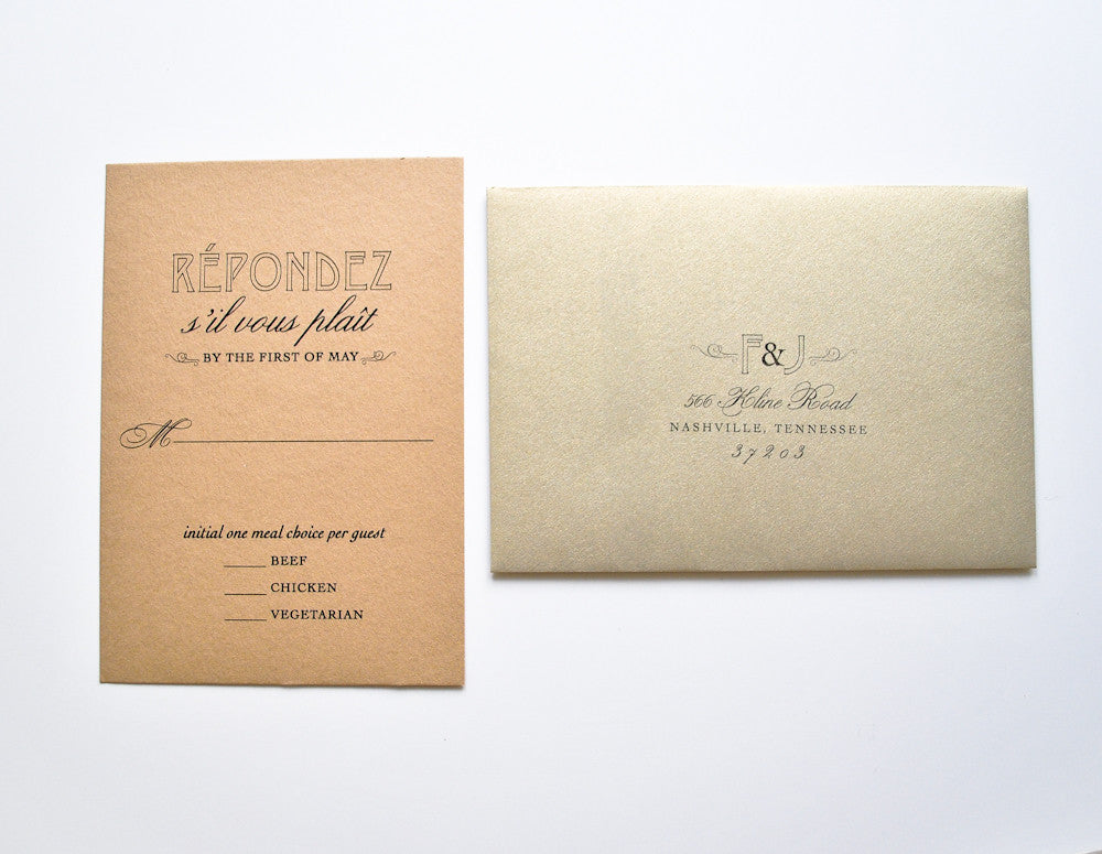 Invite purchase includes envelope with return address printing. Reply purchase includes return address printing.