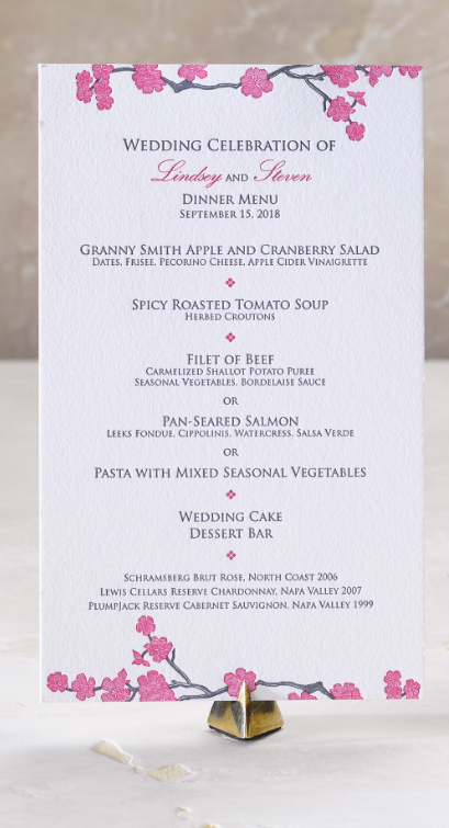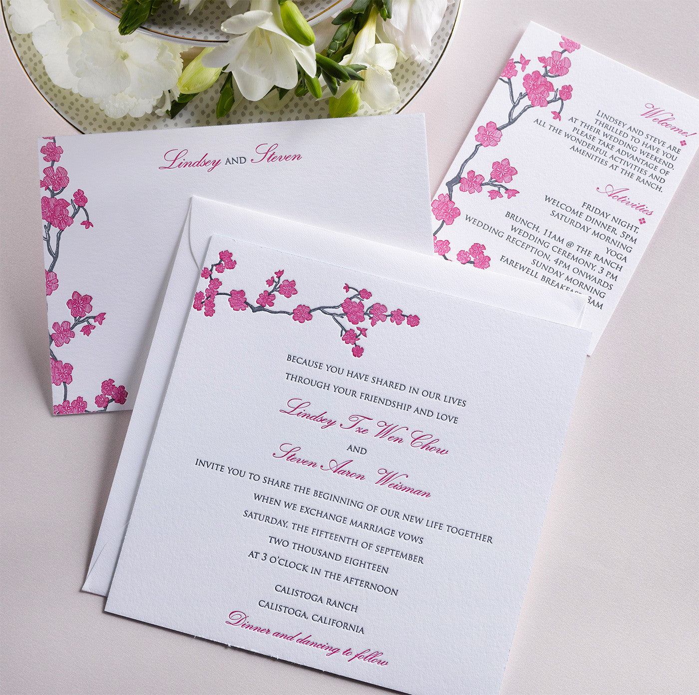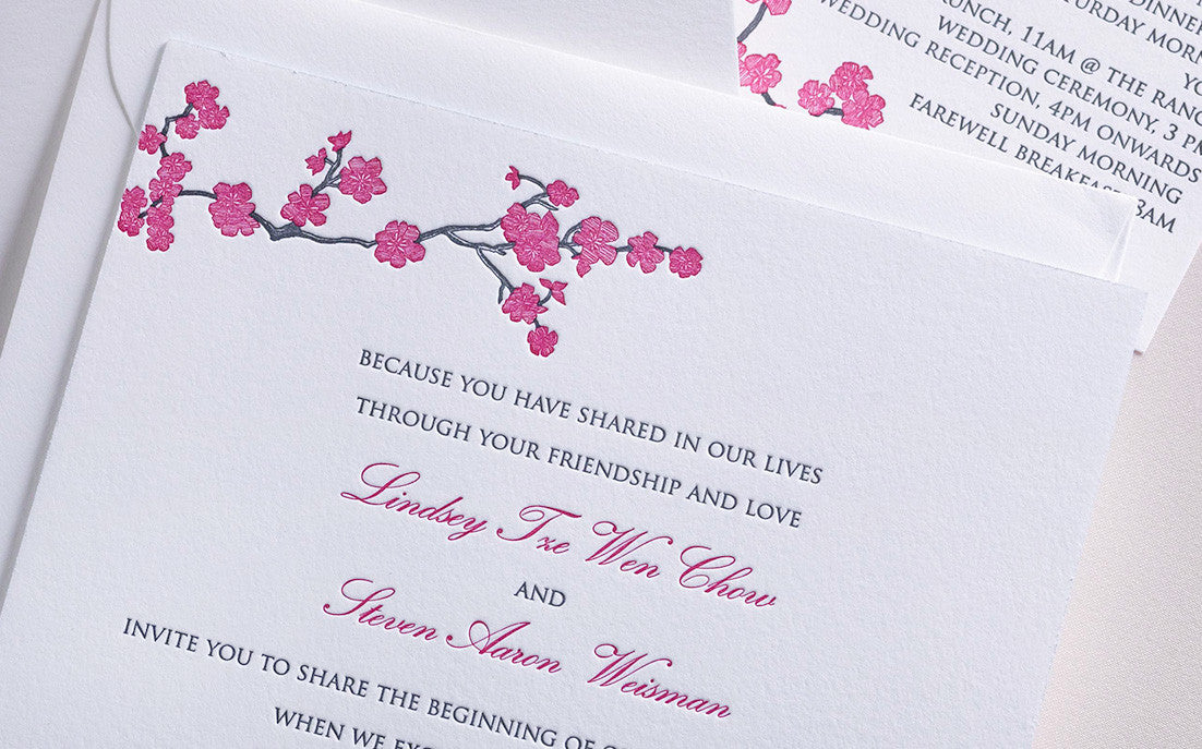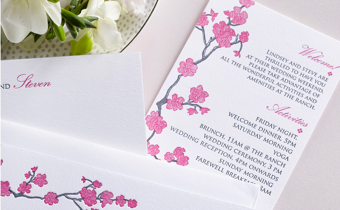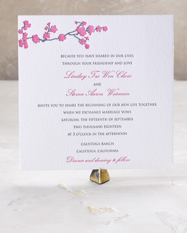 Lindsey + Steven is shown as a letterpress wedding suite by Pickett's Press. Also available with engraving, thermography, foil or digital print methods.