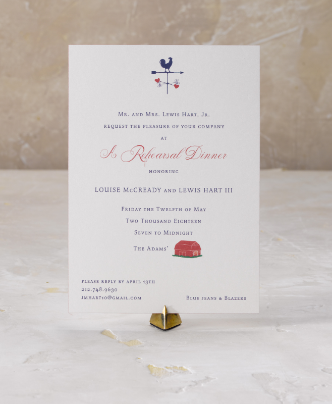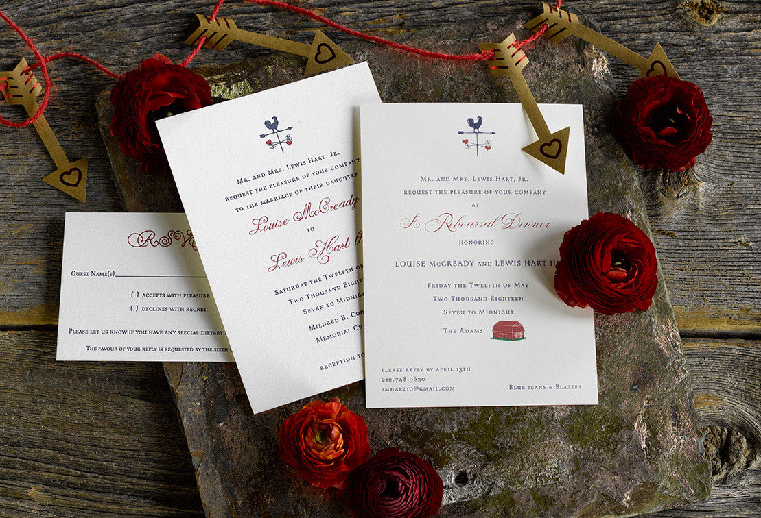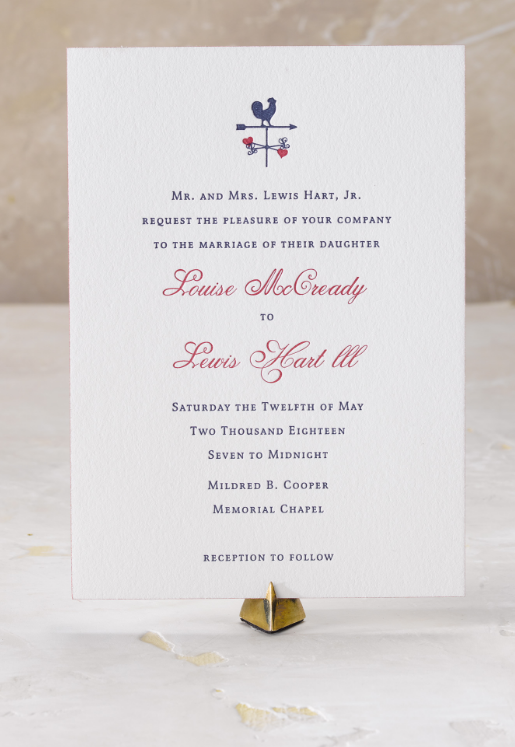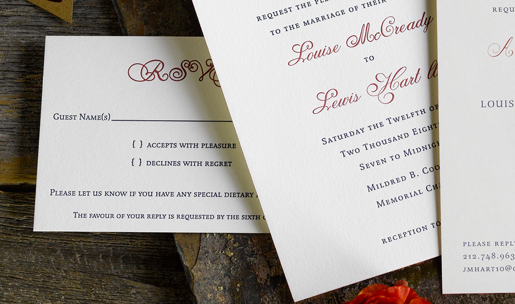 Louise + Lewis is shown as a letterpress wedding suite by Pickett's Press. Also available with engraving, thermography, foil or digital print methods.