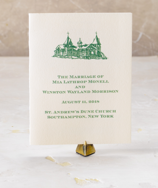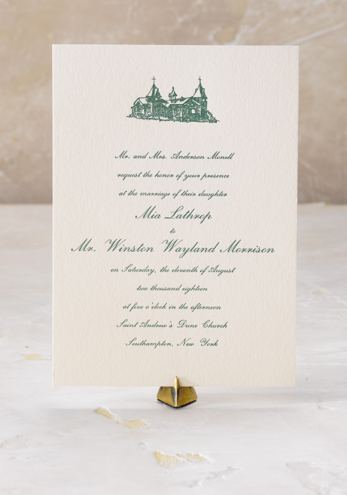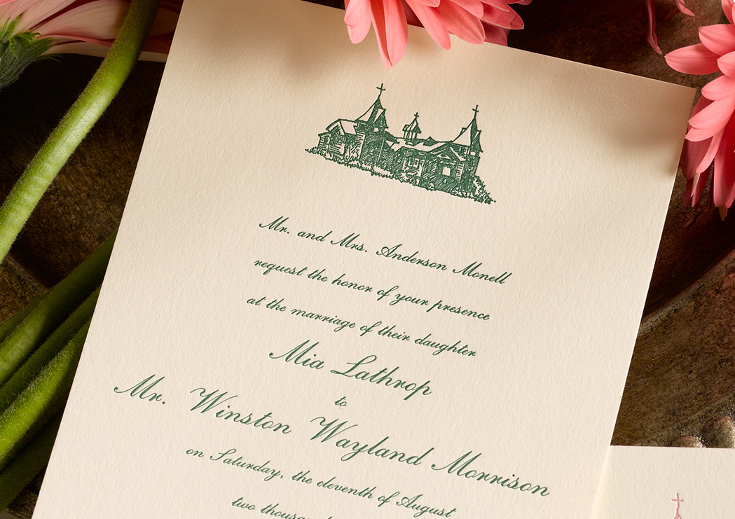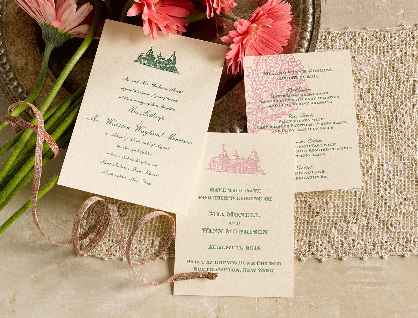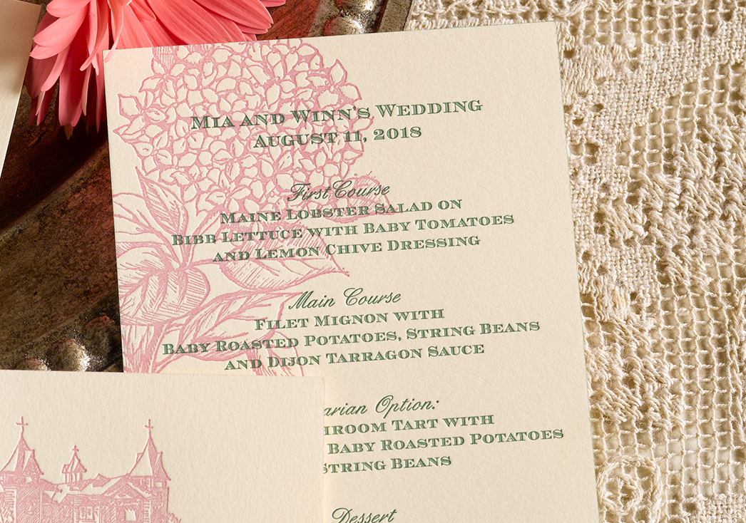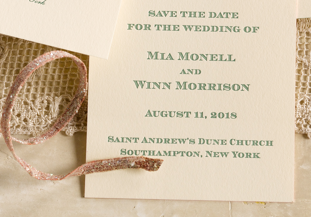 Mia + Winn is shown as a letterpress wedding suite by Pickett's Press. Also available with engraving, thermography, foil or digital print methods.