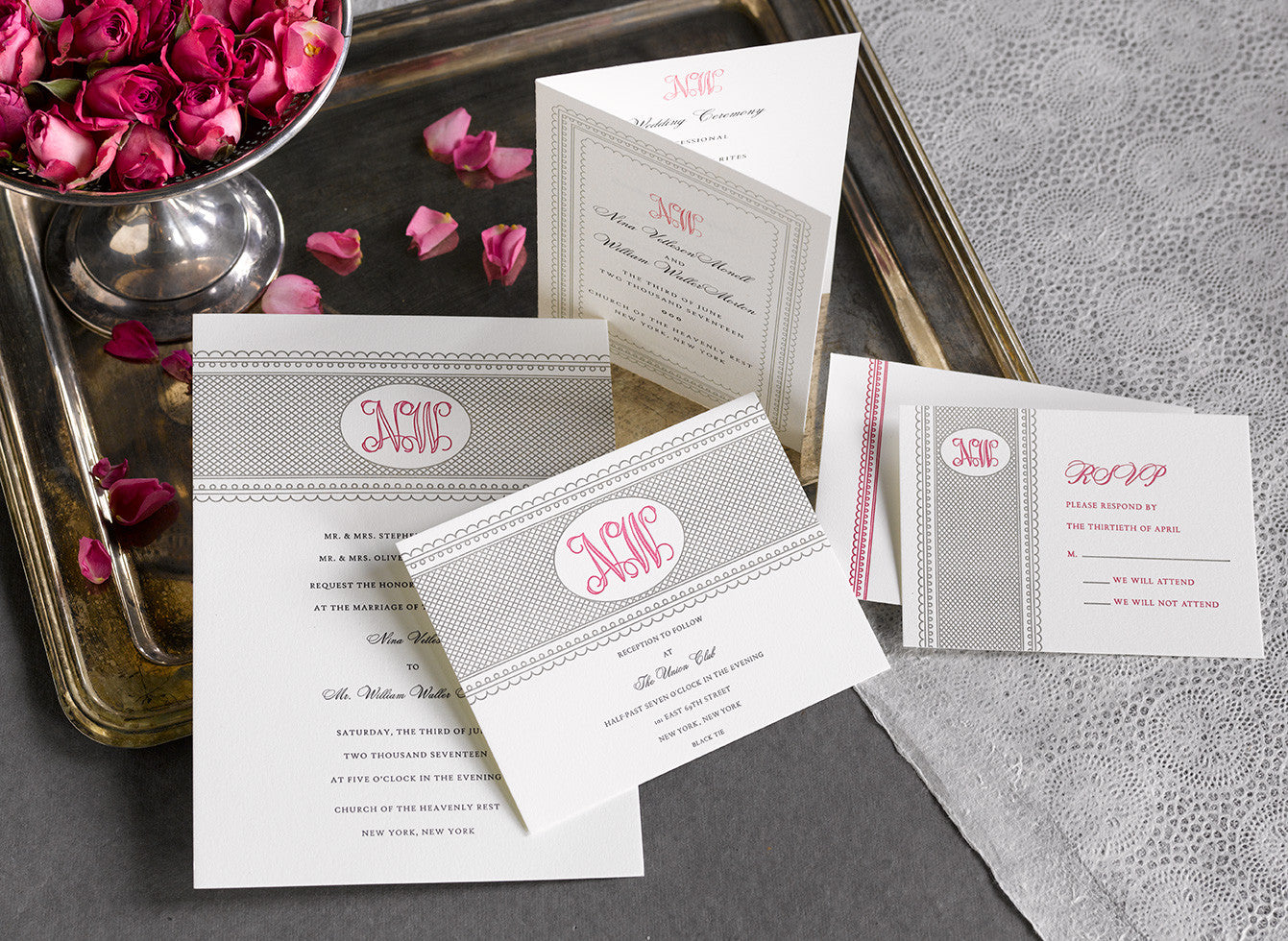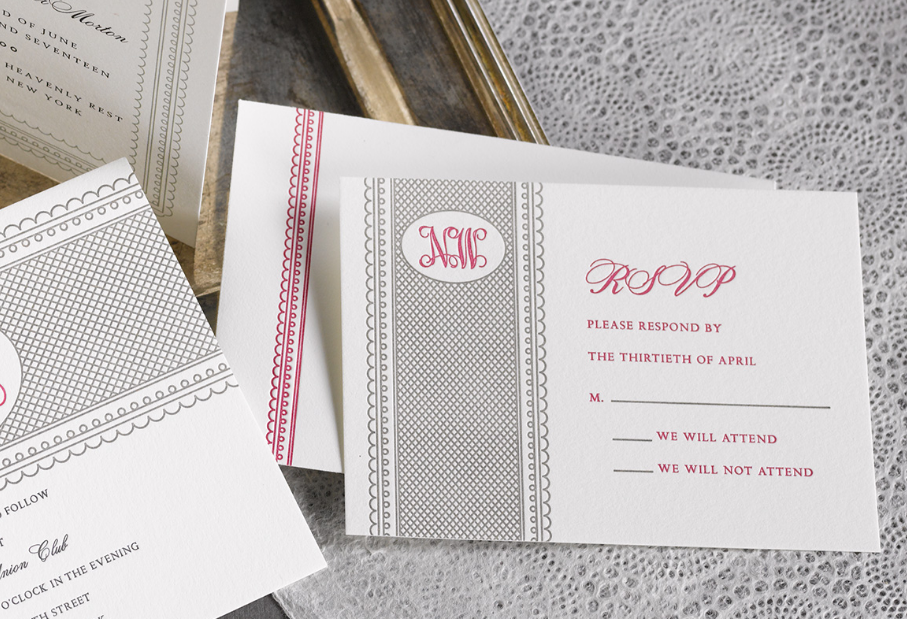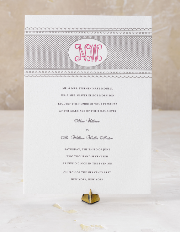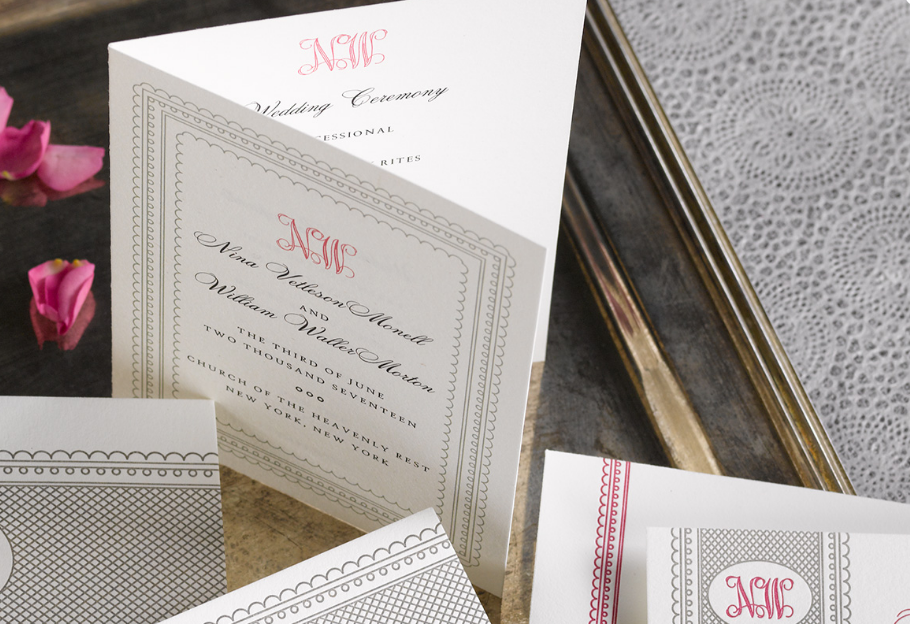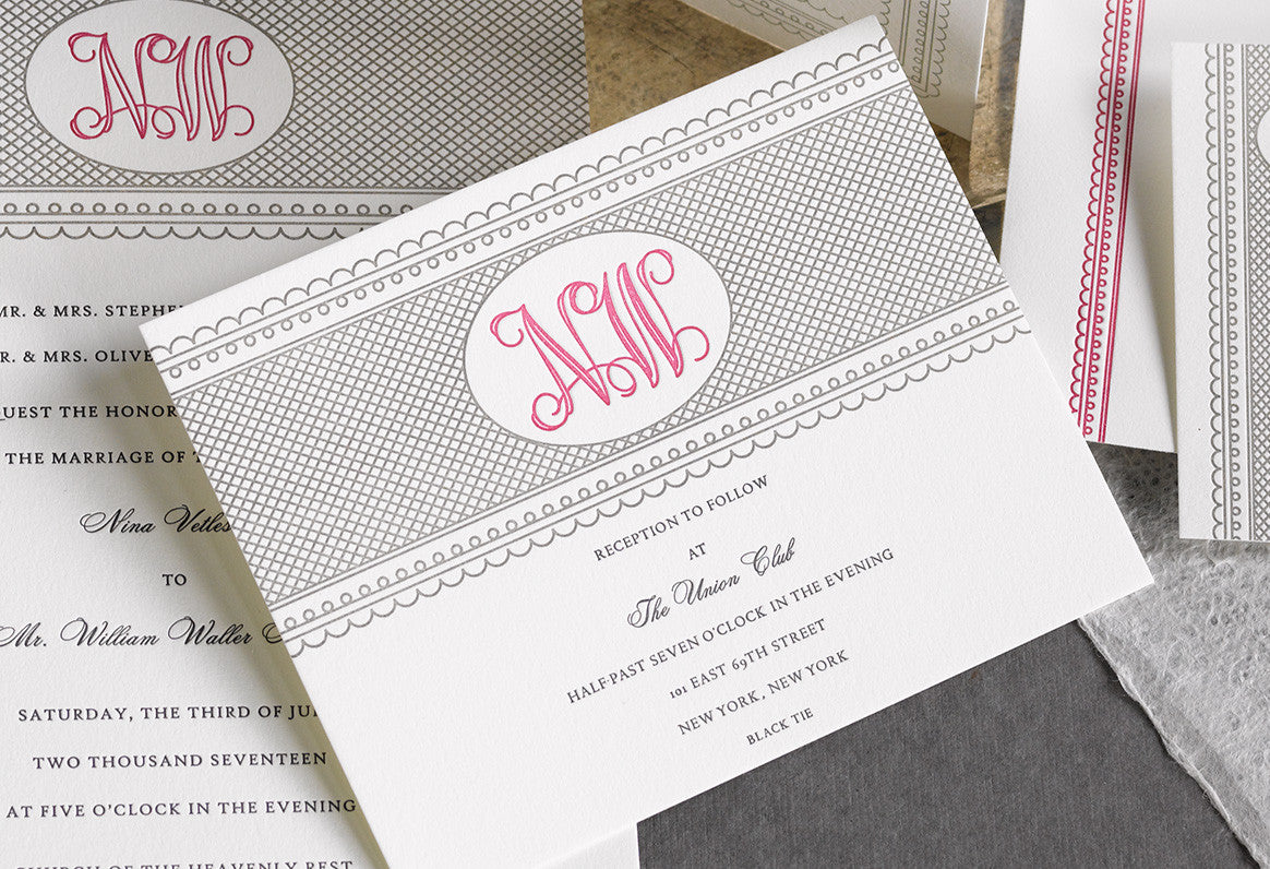 Nina + Willy is shown as a letterpress wedding suite by Pickett's Press. Also available with engraving, thermography, foil or digital print methods.