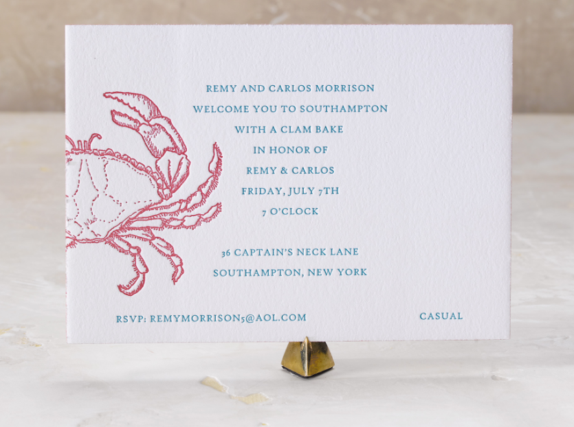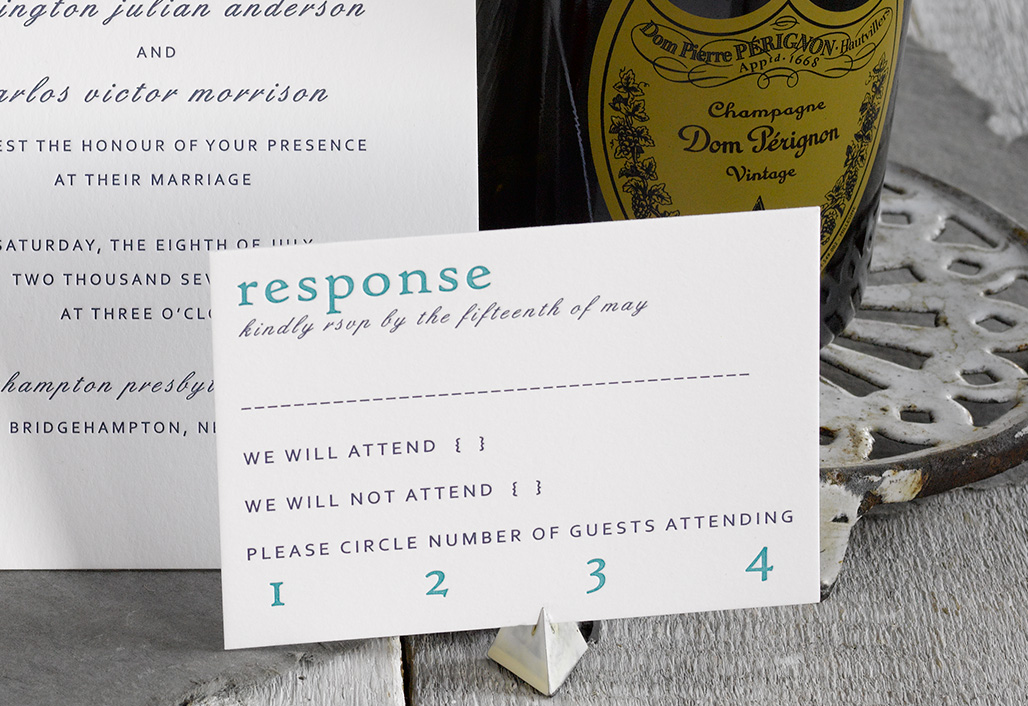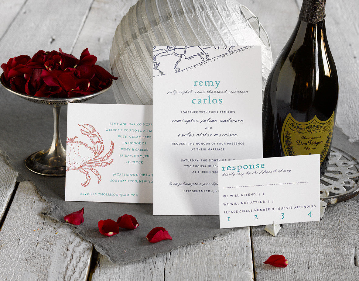 Remy + Carlos is shown as a letterpress wedding suite by Pickett's Press. Also available with engraving, thermography, foil or digital print methods.