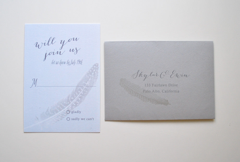 Invite purchase includes envelope with return address printing. Reply purchase includes return address printing.