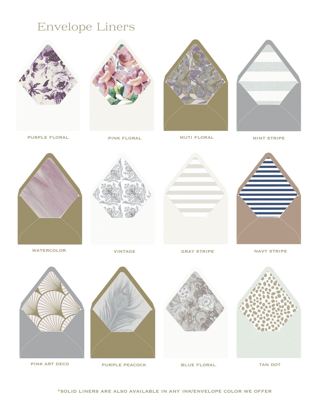 Customizable ink colors, envelope colors, paper color, printing methods & envelope liners.