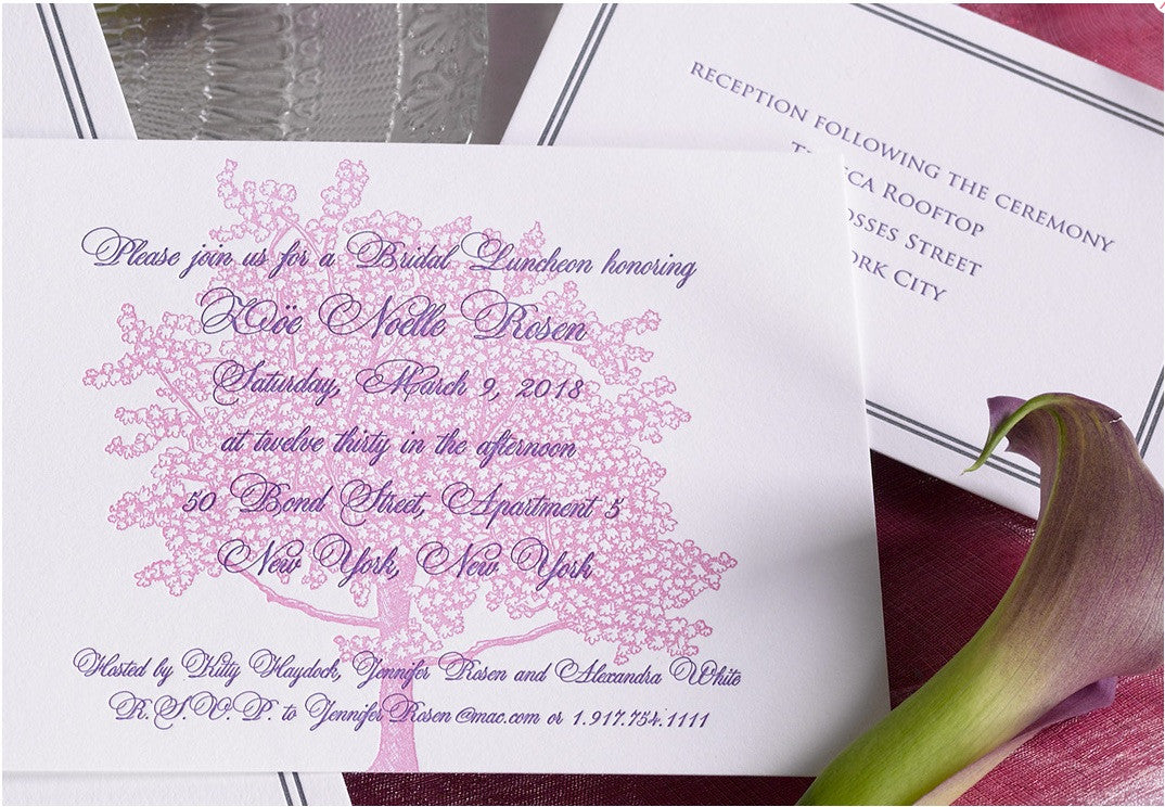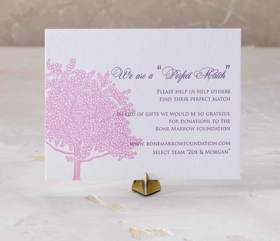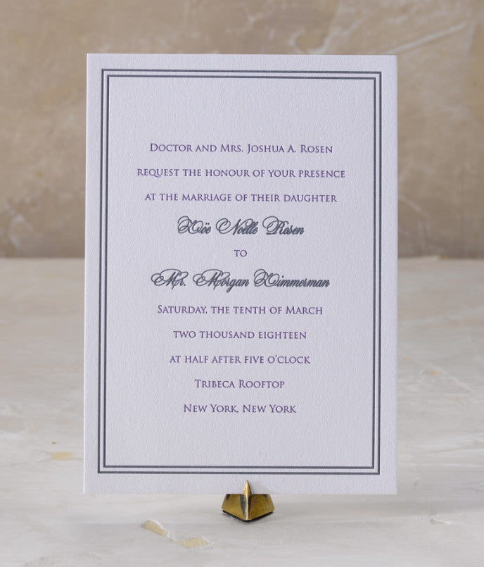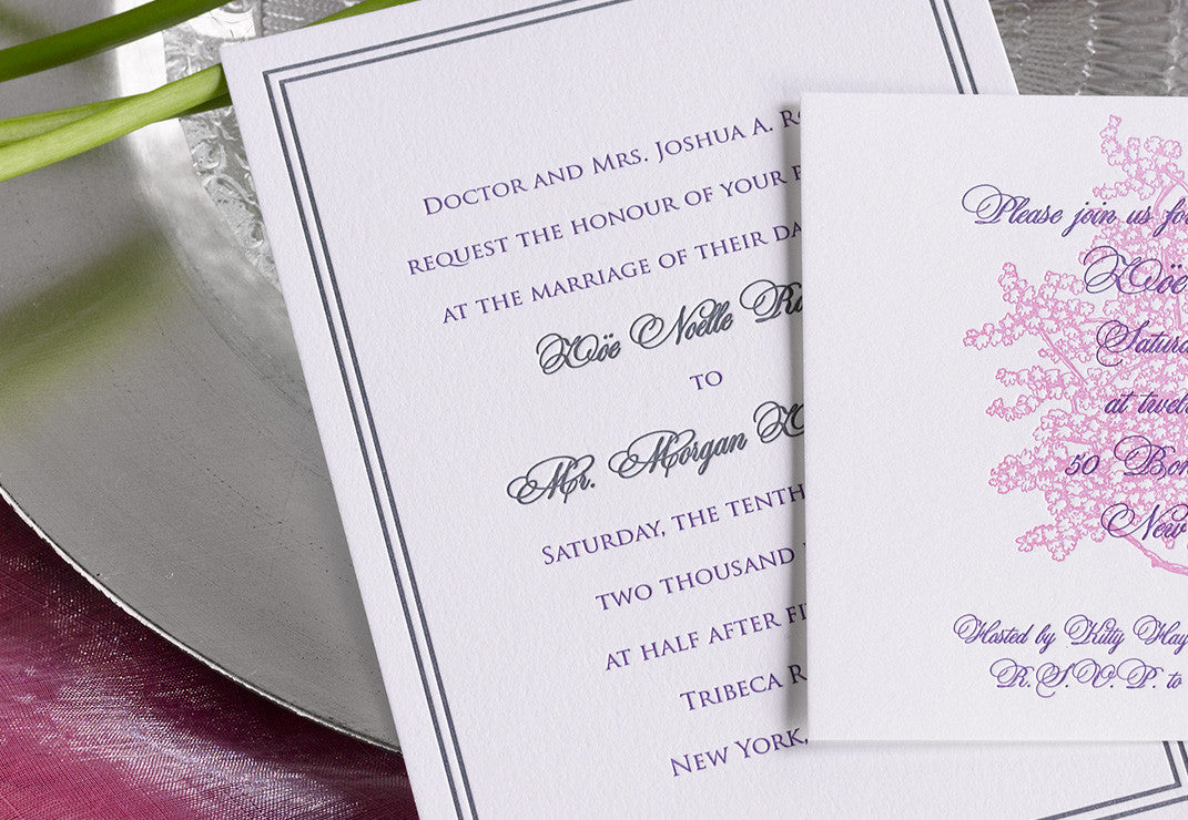 Zoe & Morgan is shown as a letterpress wedding suite by Pickett's Press. Also available with engraving, thermography, foil or digital print methods.